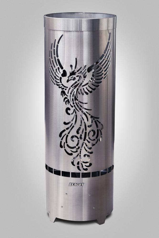 Особенности: наружный корпус электрокаменки выполнен из матовой нержавеющей стали, благодаря чему каменка будет иметь долгий срок службы, и эстетичный внешний вид, наряду с увеличенным сроком эксплуатации. Кожух выполнен в виде сплошного цилиндра с вырезом на нем контура декоративного рисунка «Жар Птица».