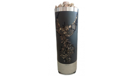 Особенности: наружный корпус электрокаменки выполнен из оцинкованной стали, выкрашен в черный цвет специальной термостойкой краской, благодаря чему каменка будет иметь долгий срок службы. Кожух выполнен в виде сплошного цилиндра с вырезом на нем контура декоративного рисунка «Жар Птица». Материал корпуса — оцинкованная сталь с термопокрытием.