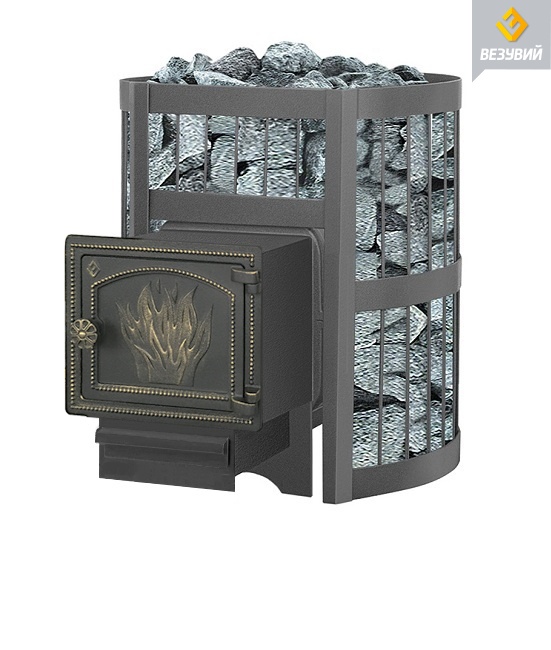 Банная чугунная печь Легенда Стандарт 12 (Дт-3) укомплектована чугунной дверцей Везувий Дт-3.  Конвекционно-вентилируемый кожух "Стандарт" изготовлен из металлического прутка диаметром 6мм покрашенной черной термостойкой краской.