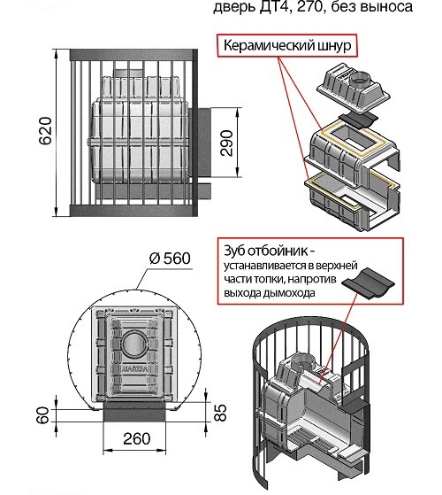Преимущество печи в том, что топка печи состоит из 3-х элементов. На стыке между ними используется керамический шнур с рабочей температурой 1200 градусов. То есть топка печи абсолютно герметична! Для фиксации деталей между собой применяется болтовое соединение, что даёт 100% гарантию безопасности при эксплуатации.
