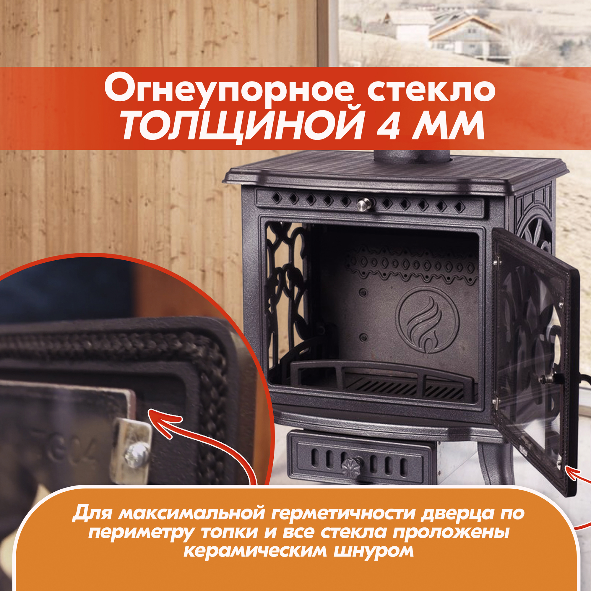 Боковые стенки и дверца печи-камина оформлены большими окнами из огнеупорного стекла, дополненными цветочным узором из чугуна.