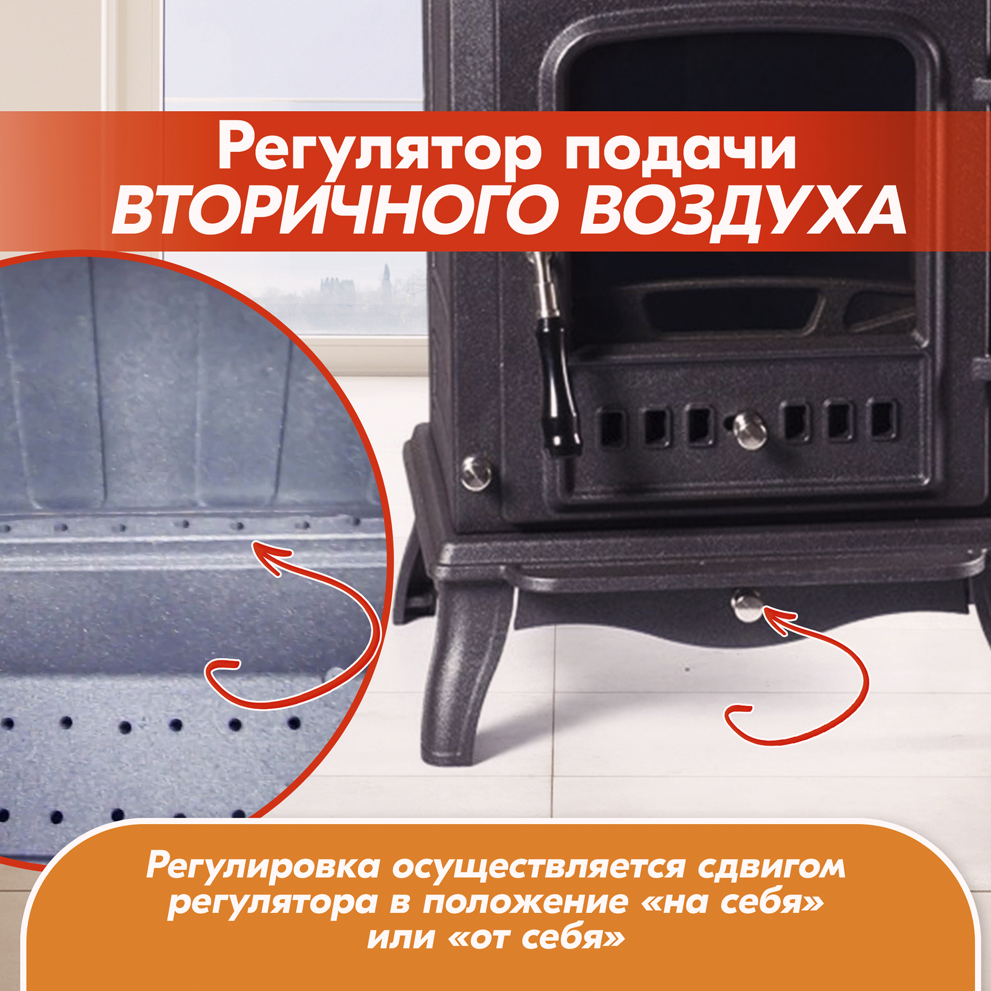 Сама система подачи воздуха расположена в верхней части задней стенки топочной камеры, а забор осуществляется снизу путем открытия и закрытия специальных отверстий при сдвиге регулятора.