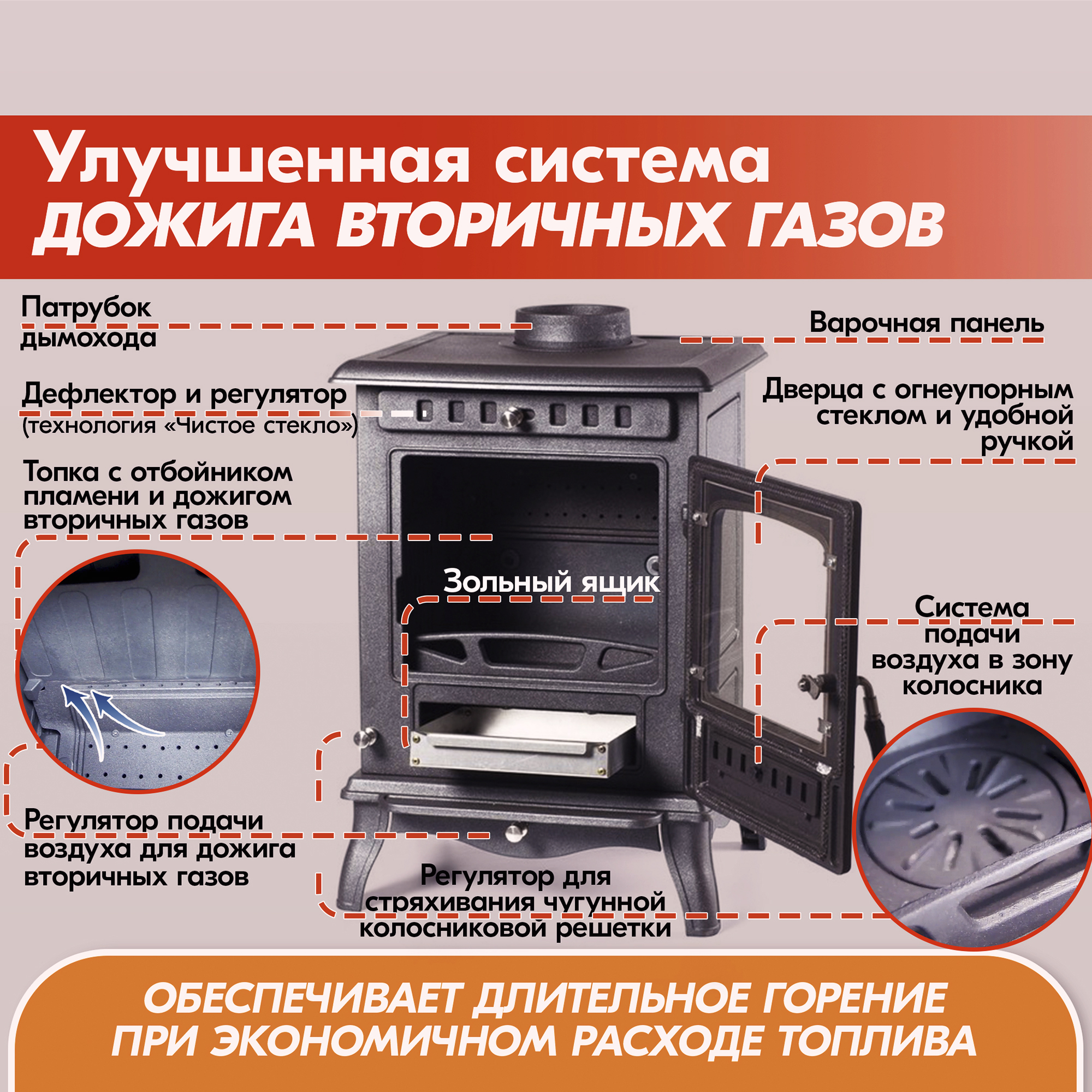 В конструкцию чугунной печи-камина внедрена система дожига вторичных газов, которая обеспечила высокий КПД камина 79% и умеренный расход топлива.