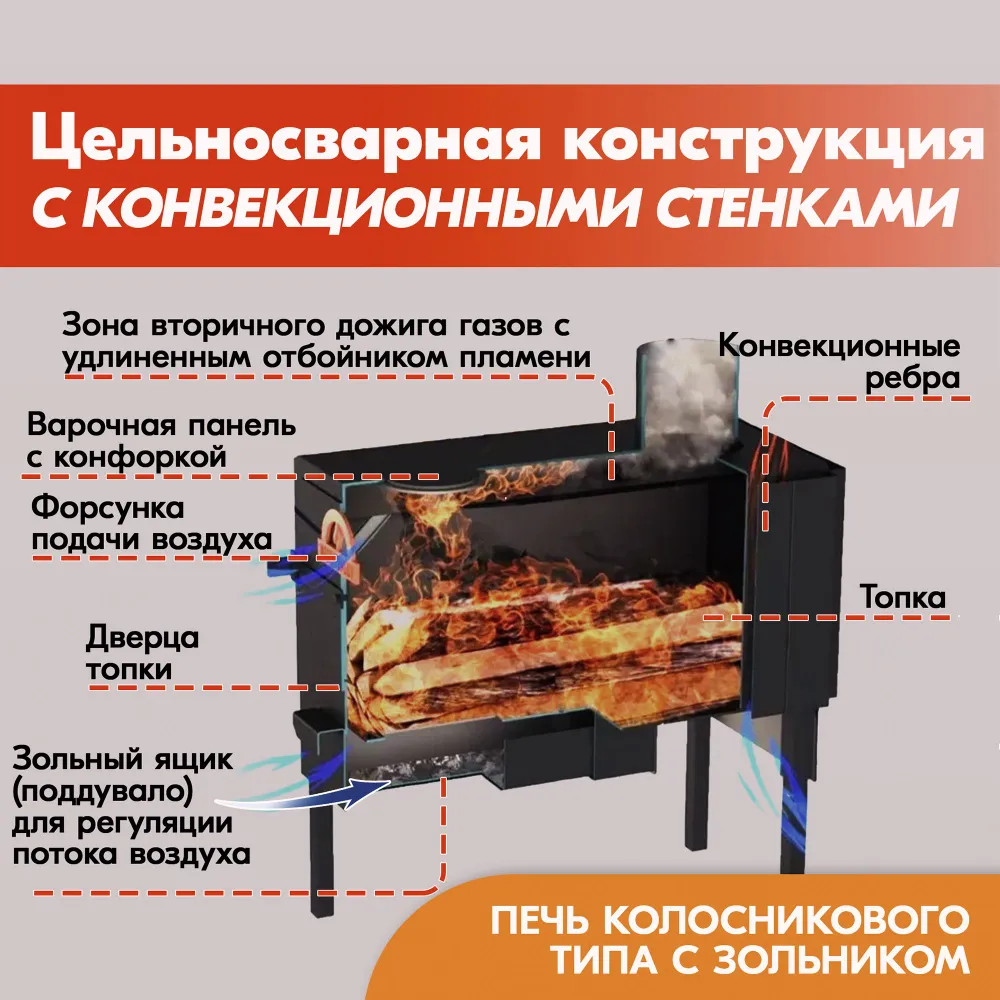 Отопительная дровяная печь Буржуйка PECHITEPLOV (ПЕЧИТЕПЛОВ) 80Б с конфоркой, зольником и конвекционными стенками, печка для дачи, гаража, в теплицу