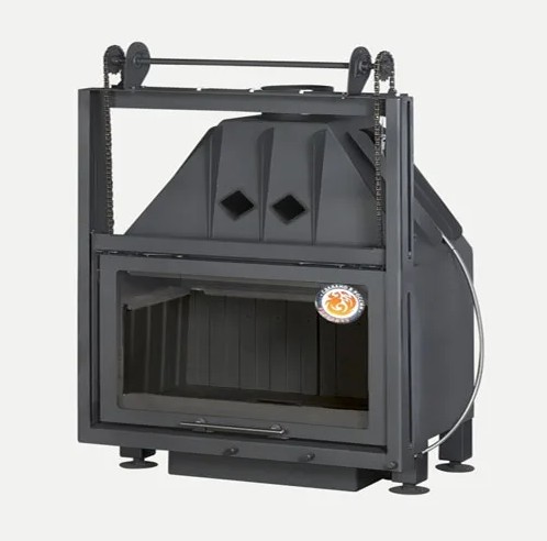 У этой модели дверь для закладки дров открывается вверх. Подъем двери легкий. Практически без усилий. Достигается это за счет противовеса, разгружающего вес двери.