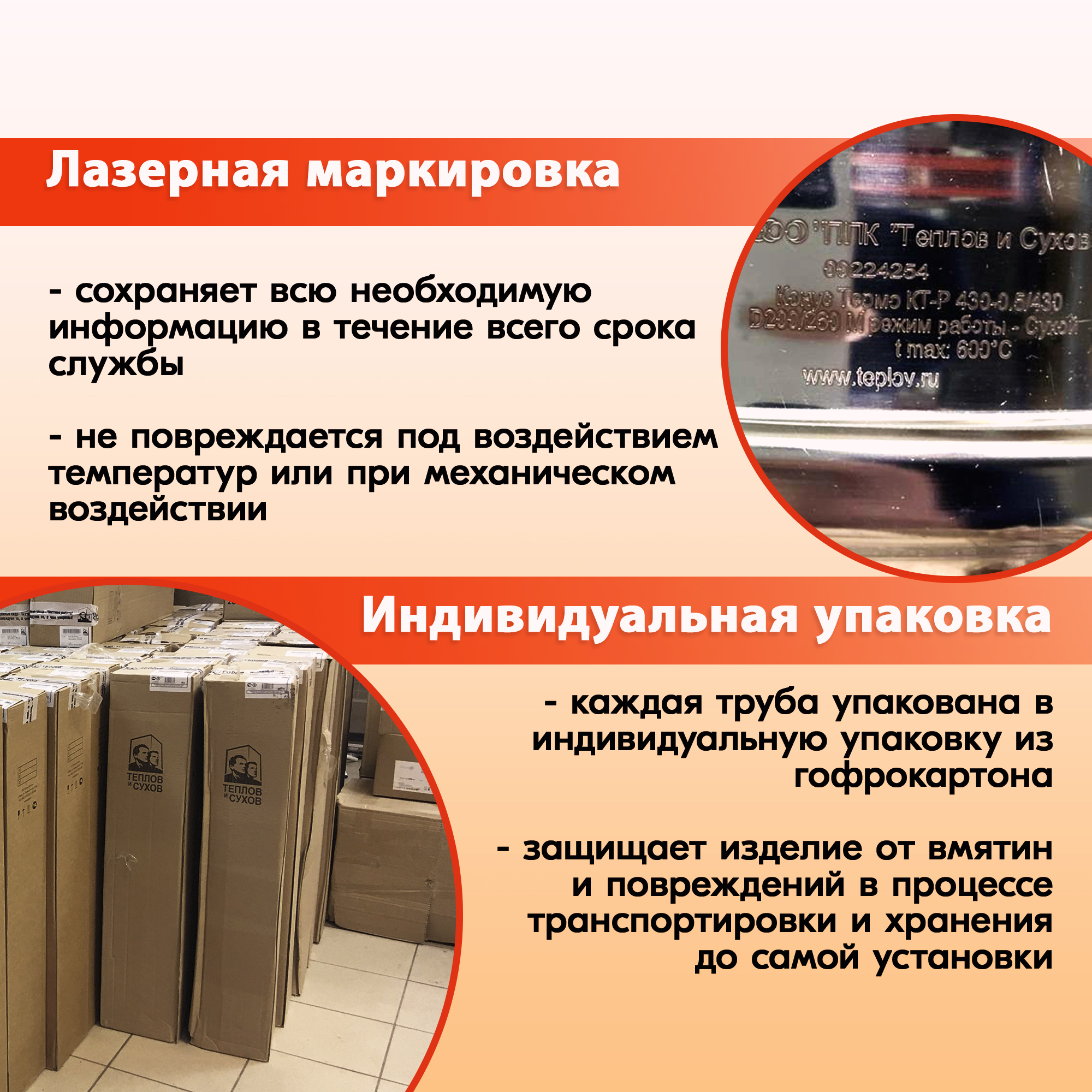 На каждой дымоходной трубе Теплов и Сухов имеется полная информация – наименование, марка стали и толщина металла, область применения.